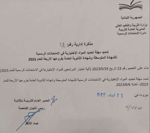 أصدر المدير العام للتربية رئيس اللجان الفاحصة عماد الأشقر مذكرتين إداريتين، حملتا الرقم 24 و25 تاريخ 26 ايار 2023، تتعلق الأولى بتمديد مهلة تحديد المواد الإختيارية في الإمتحانات الرسمية للشهادة المتوسطة وشهادة الثانوية العامة بفروعها الأربعة للعام 2023، لغاية 6 حزيران 2023.