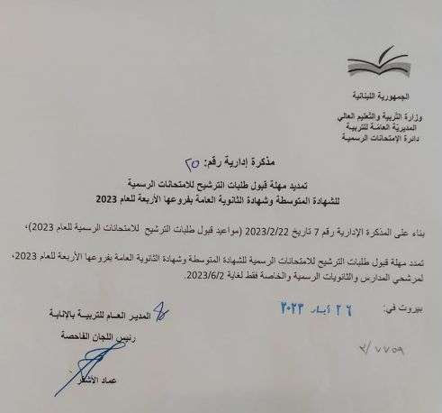 والمذكرة 25 تتعلق بتمديد مهلة قبول طلبات الترشيح للإمتحانات الرسمية للشهادة المتوسطة وشهادة الثانوية العامة بفروعها الأربعة للعام 2023، لمرشحي المدارس والثانويات الرسمية والخاصة فقط لغاية 2 حزيران 2023.