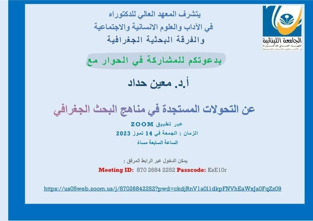 تنظم الفرقة البحثية الجغرافية في المعهد العالي للدكتوراه في الآداب والعلوم الإنسانية والاجتماعية/الجامعة اللبنانية لقاءً حواريًّا عبر تطبيق ZOOM مع الدكتور معين حداد حول «التحولات المستجدة في مناهج البحث الجغرافي».