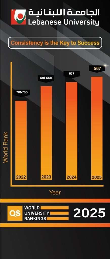 ارتفع تصنيف الجامعة اللبنانية على المستوى العالمي بحسب تقرير مؤسسة (QS) لعام 2025، لتنتقل إلى المرتبة 567 عالميّا بعدما كانت في المرتبة 577 عام 2024.
