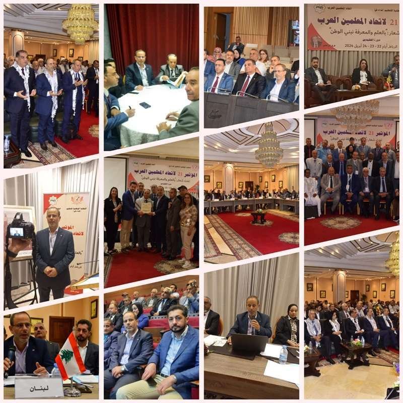 عاد وفد تجمّع المعلمين في لبنان من مشاركته في المؤتمر 21 لاتّحاد المعلّمين العرب الذي انعقد في العاصمة المغربيّة الرباط، بدعوة كريمة من النقابة الوطنيّة للتّعليم، وقد شارك الوفد، الذي تألف من الدكتور يوسف كنعان والأستاذ عباس أسعد، في جلسات المؤتمر وفعالياته الذي كان تحت شعار «بالعلم والمعرفة نبني الوطن» دورة الفقيدين هشام مكحّل وفرج المرتضى، وعلى مدار ثلاثة أيام ٢٢ و٢٣ و٢٤ نيسان 2024، ناقش المؤتمرون القادمون من ١٢ دولة عربية أوضاع الاتّحاد وآليات تطويره ليواكب قضايا المعلمين وتبادل الخبرات والتجارب، وتخلّل المؤتمر جلسة انتخاب أمانة عامة جديدة للاتّحاد فاز بالتصويت والإجماع رئيس تجمع المعلمين في لبنان الدكتور يوسف كنعان بموقع الأمين العام لشؤون التربية والتعليم والبحث العلمي.