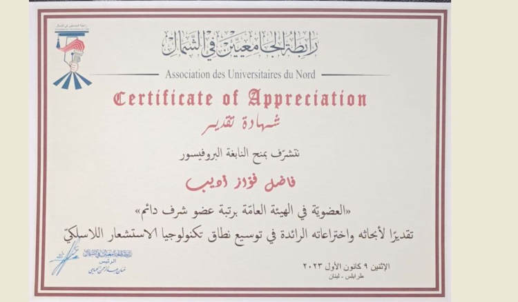 أعلنت «رابطة الجامعيين في الشمال» في بيان، أنها «منحت النابغة البروفيسور فاضل فواز أديب العضوية في هيئتها العامة برتبة عضو شرف دائم، تقديرا لأبحاثه واختراعاته الرائدة في توسيع نطاق تكنولوجيا الاستشعار اللاسلكي».