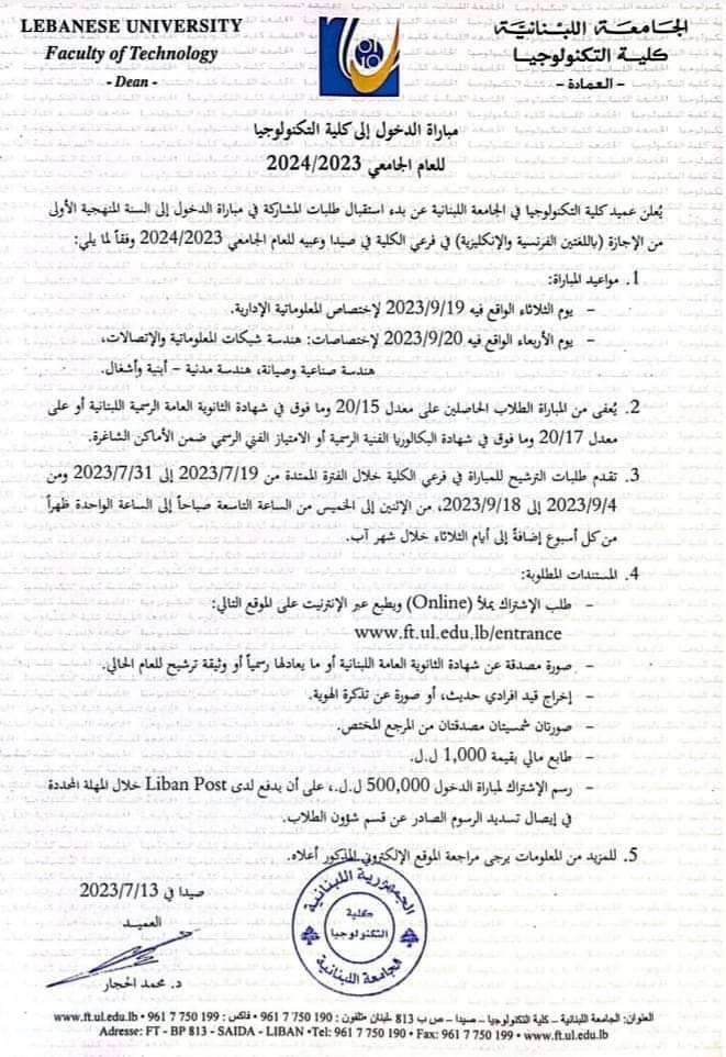 مباراة الدخول إلى كلية التكنولوجيا للعام الجامعي 2023-2024 الخميس 13 تموز 2023 الجامعة اللبنانية العام الجامعي 2023-2024 كلية التكنولوجيا مباراة دخول Share on TwitterTweet Share on LinkedIn Share Send email Mail Print Print