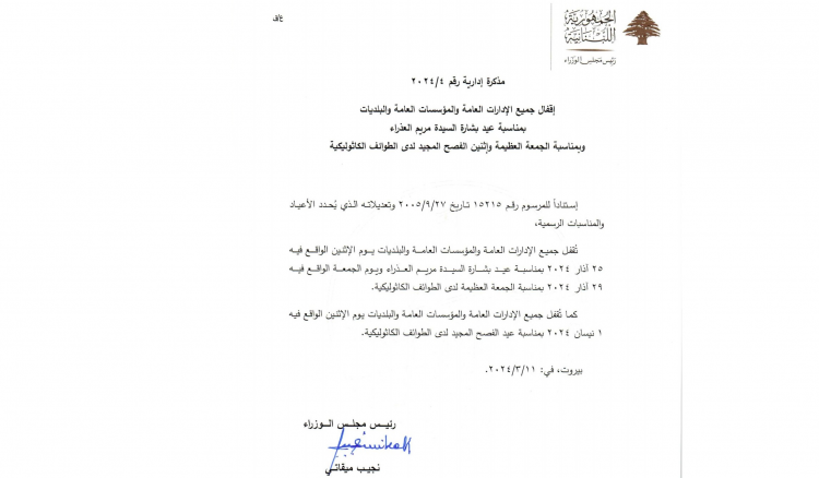 أصدر رئيس مجلس الوزراء مذكرة ادارية تحمل الرقم 2024/4 تقضي باقفال جميع الادارات العامة والمؤسسات العامة والبلديات بمناسبة عيد بشارة السيدة مريم العذراء وبمناسبة الجمعة العظيمة واثنين الفصح المجيد لدى الطوائف الكاثوليكية. وجاء في نص المذكرة الاتي: