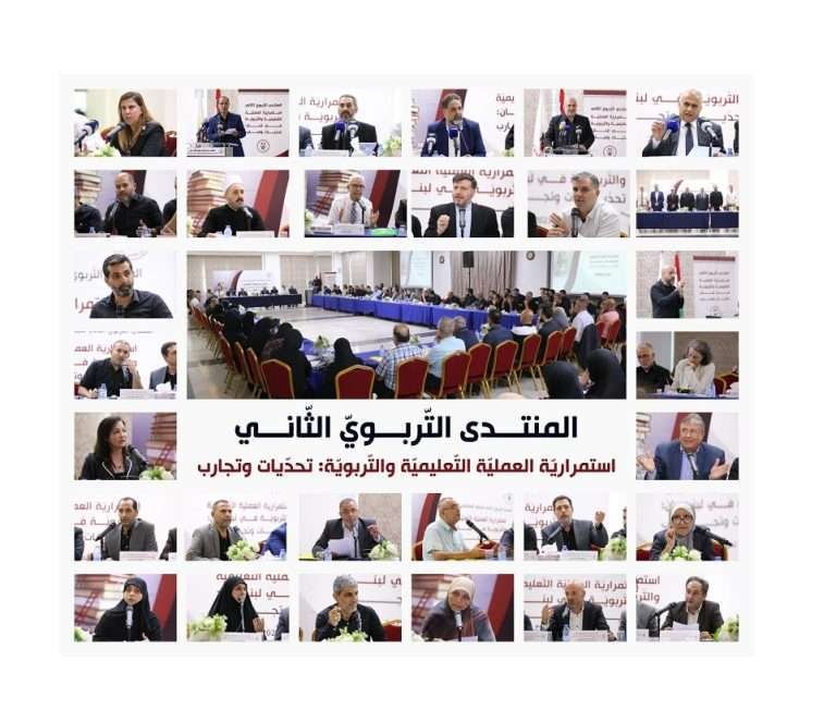 عقد «المنتدى التّربويّ الثاني» تحت عنوان «استمرارية العمليّة التّعليميّة والتربويّة في لبنان: تحدّيات وتجارب»، برعاية وحضور رئيس كتلة الوفاء للمقاومة النائب الحاج محمّد رعد وبدعوة من تجمّع المعلّمين في لبنان، شارك فيه النائب د. إيهاب حمادة، النائب د. إدغار طرابلسي، ومسؤول التّعبئة التربويّة الحاج يوسف مرعي، والمدير العام للتّربية الأستاذ عماد الأشقر، ورئيسة المركز التربويّ للبحوث والإنماء البروفيسورة هيام إسحق، ومدير التّعليم الثّانوي في وزارة التّربية الدّكتور خالد الفايد ومنسّق اتّحاد المؤسّسات التّربويّة الخاصّة أمين عام المدارس الكاثوليكيّة الأب يوسف نصر، ومدير عام مدارس المصطفى الحاج محمد سماحة، والأمين العام للمدارس الإنجيليّة د.نبيل قسطا، وممثّلة المدارس الأرثوذكسية د. نايلة ضعون، وممثّل جمعية المقاصد الأستاذ أحمد غلاييني، وعضو الهيئة الإداريّة لتجمّع الأطباء المسلمين د.فضل شحيمي، وممثلو عن المؤسّسات التّربويّة: العرفان، أمل التّربويّة، مدارس الإيمان ومدارس المهدي، وممثلو المكاتب التّربويّة في حركة أمل، والحزب التّقدمي الاشتراكي، وتيار المردة، والجماعة الإسلاميّة، والحزب السّوري القومي الاجتماعيّ، والمكتب التّربوي الإسلامي، وتيار الكرامة، وحزب التّوحيد العربي، إضافة إلى روابط التّعليم الرّسمي (ثانوي ومهني وأساسي)، ونقيب المعلّمين في المدارس الخاصّة الأستاذ نعمة محفوض، ومديريات وزارة التّربية، وحشد من مدراء وأساتذة المعاهد والمدارس والثانويات الرسميّة والخاصّة الأكاديميّة والمهنيّة والفنّيّة.