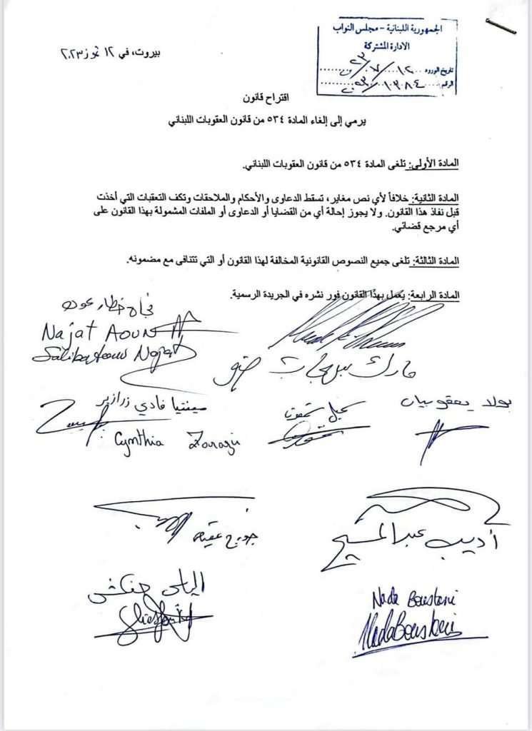 المفارقة أن هناك إقتراح قانون تقدمت به مجموعة من النواب لإلغاء المادة 534 من قانون العقوبات اللبنانية ومسجل لدى مجلس النواب تحت رقم ١٣٨٤  بتاريخ ٧ تموز ٢٠٢٣، ويدعو الإقتراح صراحة الى إسقاط جميع الملاحقات والأحكام والدعاوى وكفّ التعقبات الناشئة عن المادة ٥٣٤ من قانون العقوبات اللبناني، في ظل غيبوبة للبعض من مناهضي المثلية، وعلى ما يبدو أن التعامل مع هكذا قضايا بات يشبه مقولة «جحا ما بيقدر إلا ع خالتو».
