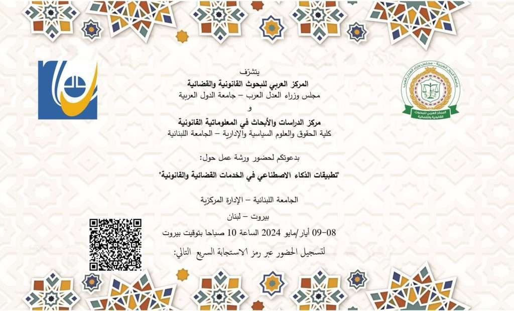 يتشرف المركز العربي للبحوث القانونية والقضائية مجلس وزراء العدل العرب – جامعة الدول العربية ومركز الدراسات والأبحاث في المعلوماتية القانونية كلية الحقوق والعلوم السياسية والإدارية – الجامعة اللبنانية بدعوتكم لحضور ورشة عمل حول: «تطبيقات الذكاء الاصطناعي في الخدمات القضائية والقانونية».