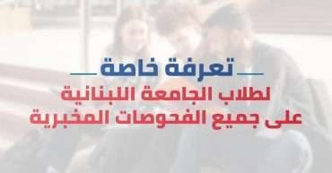تعرفة خاصة لطلاب الجامعة اللبنانية على الفحوصات المخبرية في المركز الصحي الجامعي في الجامعة اللبنانية الجمعة 19 نيسان 2024 للمزيد من المعلومات الخاصة التواصل على الرقم (+961 5 470 981) المكان: الجامعة اللبنانية – مجمع رفيق الحريري الجامعي – الحدت الجامعة اللبنانية الفحوصات المخبرية المركز الصحي الجامعي تعرفة خاصة